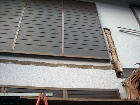 | 元々は、外壁と一体型のバルコニーでした。 床が、きしむ事と、雨が漏った後のシミが出ていましたので、危険な為、工事を行う事となりました。 | やはり、中の木材は、かなり腐食が進んでいました。 |