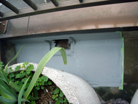 | 樹脂モルタルを塗り、下地を整えます。 | 全面、塗り終わり、だんだん乾いてきました。 |