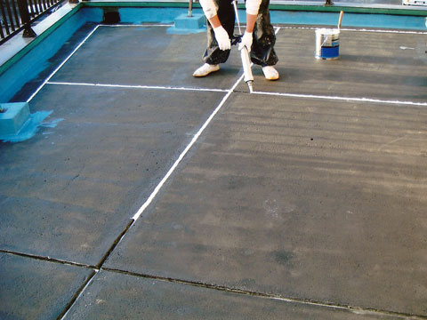 | 目地のウレタンシール処理が終わったら、平場も同様に、メッシュを張り、ウレタンを塗ります。 | メッシュとウレタンの組み合わせで、こんな感じになります。 |